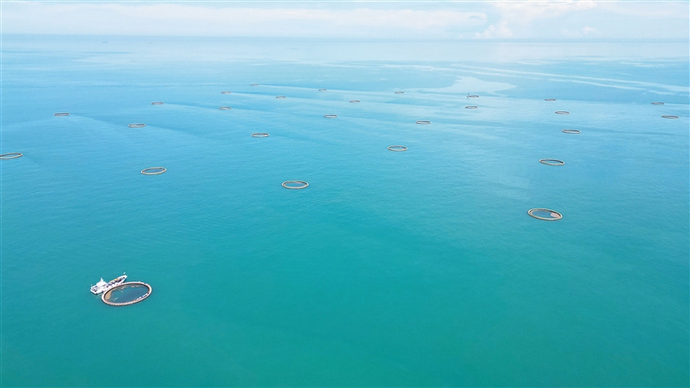海南神农水产种源科技有限公司在峨蔓海域开展金鲳鱼深海网箱养殖。海南神农水产种源科技有限公司供图