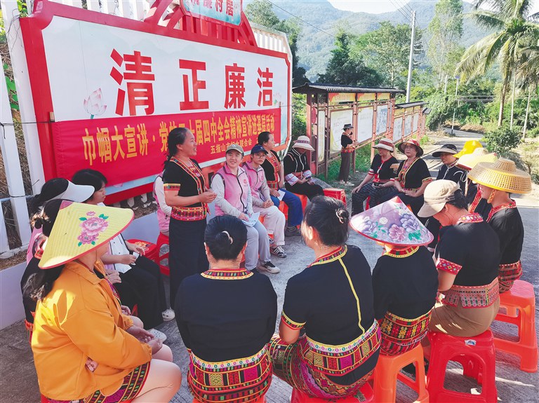 11月12日下午,五指山市毛阳镇毛兴村委会办公楼旁,三角梅开得正艳。座椅围成的“会场”没有讲台、没有距离间隔,毛阳镇宣传委员、妇联主席王志苗及6位五指山娘子军宣讲团成员和村民们围坐一圈,面对面讲政策、拉家常、话发展。