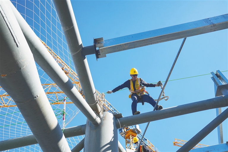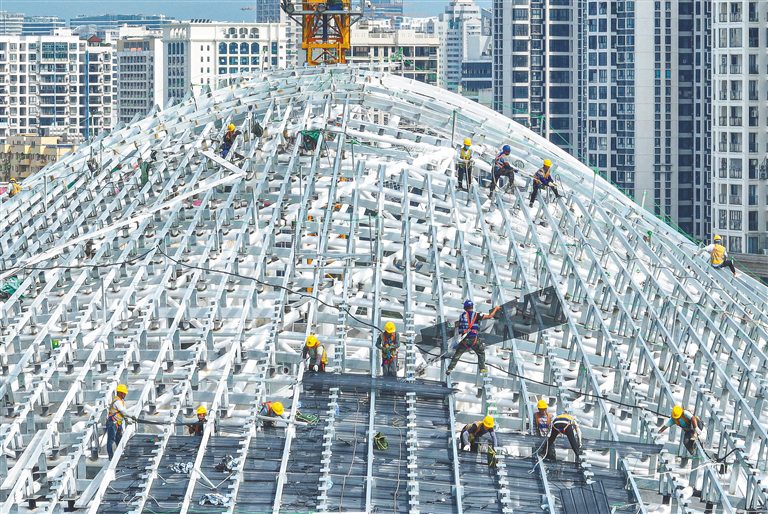 11月12日,位于三亚中央商务区的中国海南国际文物艺术品交易中心,工人们在屋面组装钢结构。海南日报全媒体记者 王程龙 摄