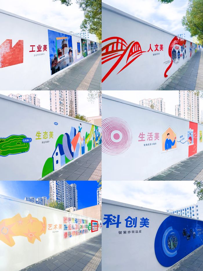 工业美板块中,百年工业遗迹的元素被巧妙融入画面,老式厂房与现代创新符号交织,静静诉说着定海工业的岁月变迁与时代新生;人文美深挖本土底蕴,通过一系列社区活动展示激活自治活力,于方寸之间厚植乡土情怀,彰定海显邻里守望的人文底色;生态美通过展示废弃塑料瓶再生作品,宣扬绿色生活风尚,传递人与自然共生共荣的生态之道。生活美板块紧扣15分钟生活圈建设,引导居民发现平凡生活中的小确幸、发现日常生活中的美好瞬间;艺术美则为居民与学生提供了创作舞台,让墙面成为流动的艺术展厅;科创美板块以科技元素为灵感,建设未来岛图案展现着科技赋能下的城市新风貌,让居民感受科技赋能下的城市新风貌。