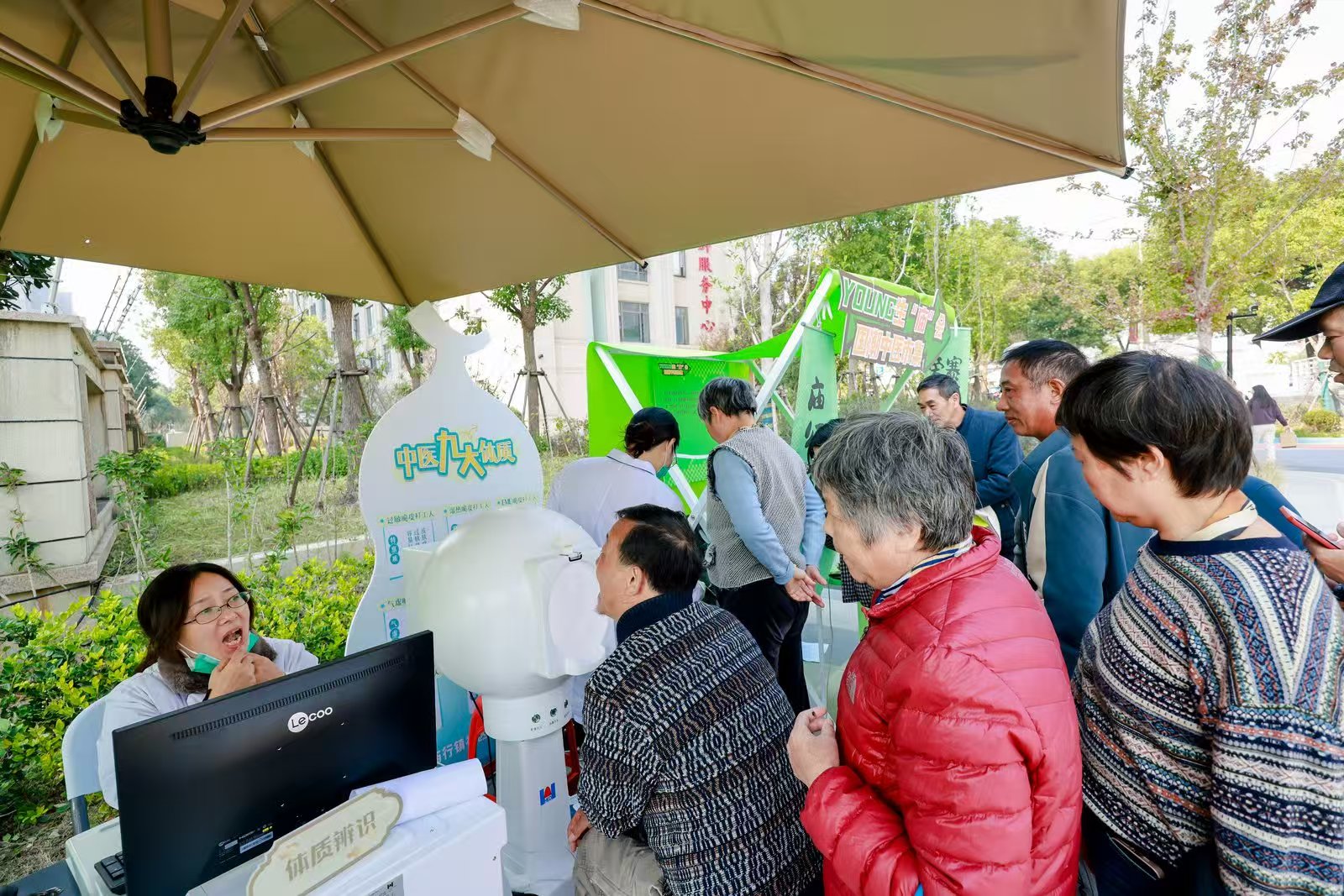 市集精准对接年轻群体需求,用“潮言潮语”和创新形式打破中医“传统古板”的刻板印象。罗店医院推出的中药手串,以檀香、陈皮等药材为原料,兼具疏肝理气功效与时尚质感,被打工人亲切称为养生“谷子”,成为现场爆款文创;宝山区中西医结合医院打造的联名中药奶茶和古法小吊梨汤,将草本精华与现代饮品结合,让秋冬润燥养生变得清甜可口。还有“赛博老中医”智能检测区,通过舌脉象分析仪、体质检测仪等黑科技,一键生成专属养生建议,吸引大量年轻人打卡体验,用科技赋能让中医走进年轻生活。