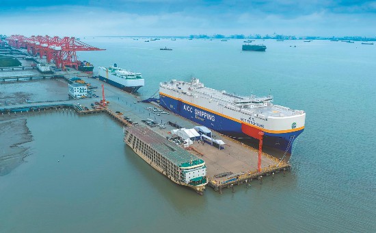 为稳定我国汽车出口运输供应链,满足“皖车出海”的强劲需求,安徽省港航集团积极与上海港携手共建江海直达运输体系,开通首条地中海、首条西北欧、首条南美等国际汽车滚装航线,通过自有运力、租船、买舱、换舱等方式,将航线覆盖至33个国家56个枢纽港口。安徽省港航集团投资约20亿元建造3艘7000车位LNG双燃料远洋滚装船、5艘330车位内河滚装船。