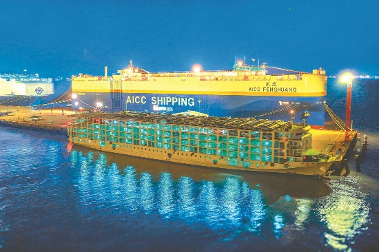 9月28日晚,上海外高桥海通国际滚装码头,“凤凰”轮正在装车,准备开启首航。