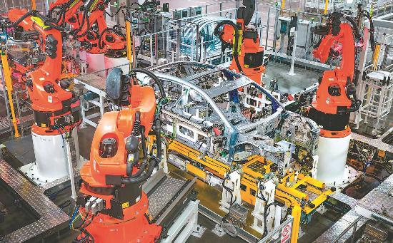 9月16日,位于合肥肥西的江淮汽车尊界超级工厂,机器人在焊接车架。