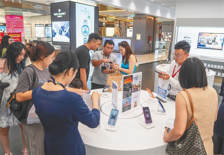 10月8日,在海口日月广场的海控全球精品免税城,不少消费者选购免税品。今年国庆中秋假期,海南离岛免税经营主体通过拓宽消费场景、推出促销活动等方式,持续释放消费活力。