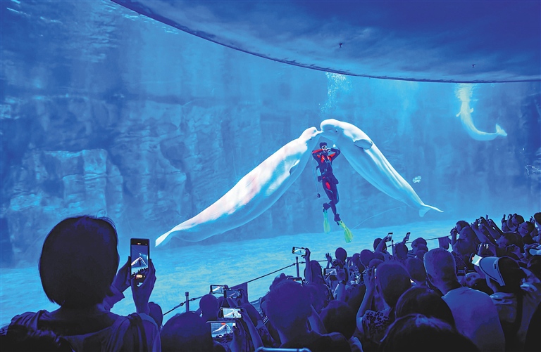 国庆中秋假期,儋州海花岛旅游度假区海洋乐园,游客们近距离观赏白鲸与潜水员互动。本版图片除署名外均由海南日报全媒体记者 陈元才 通讯员 伍卓千 摄