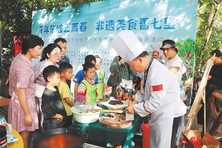 北宋绍圣四年,苏东坡谪居儋州,将中原文化与东坡肉烹制技艺带入海南,至今已传承近千年。儋州东坡肉在承袭古法基础上,发展出“慢火、少水、多酒”的独特工艺,2023年12月被列入第六批省级非物质文化遗产代表性项目名录。从葱姜处理、猪肉焯水煎制,到加料烧制、隔水慢蒸……活动现场,获“中国烹饪大师”“儋州十大金牌厨师”称号的陈生强展示着这门非遗技艺,块形方正、色泽红亮、香糯不腻的成品让在场市民游客赞不绝口。