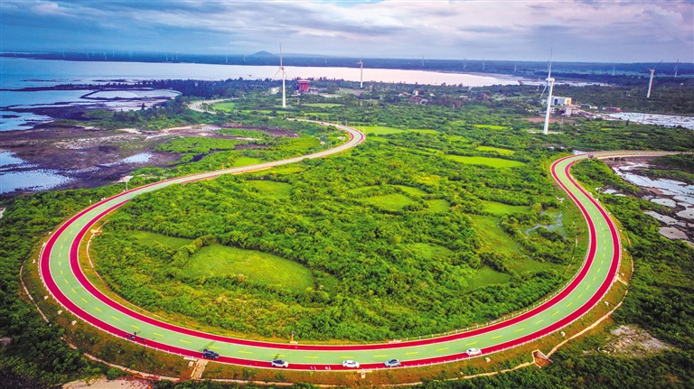 环岛旅游公路儋州段像一条“宝石项链”,串起了沿途的风车、巨石、激浪、海湾和灯塔等“珍珠”,“一半海水一半火山”的神奇海景让游客叹为观止、流连忘返。“这里和我以前见过的海很不一样,海边的石头是黑色的,我很喜欢这里。”来自杭州的小游客车车说。