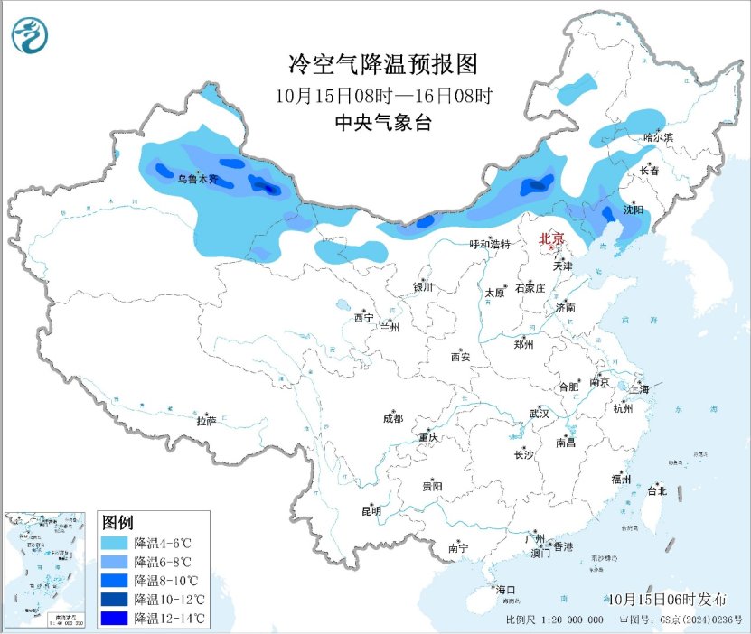 最后关注较强冷空气带来的大风降温天气,该冷空气影响范围广、持续时间长。预计10月15日至10月19日,冷空气将自西向东、自北向南影响我国大部地区,上述地区将有4~6级风,阵风7~9级,新疆山口风力10~11级;日平均气温普遍下降4~8℃,其中内蒙古中西部、华北北部、东北地区南部及湖南、贵州等地部分地区降温10℃以上。