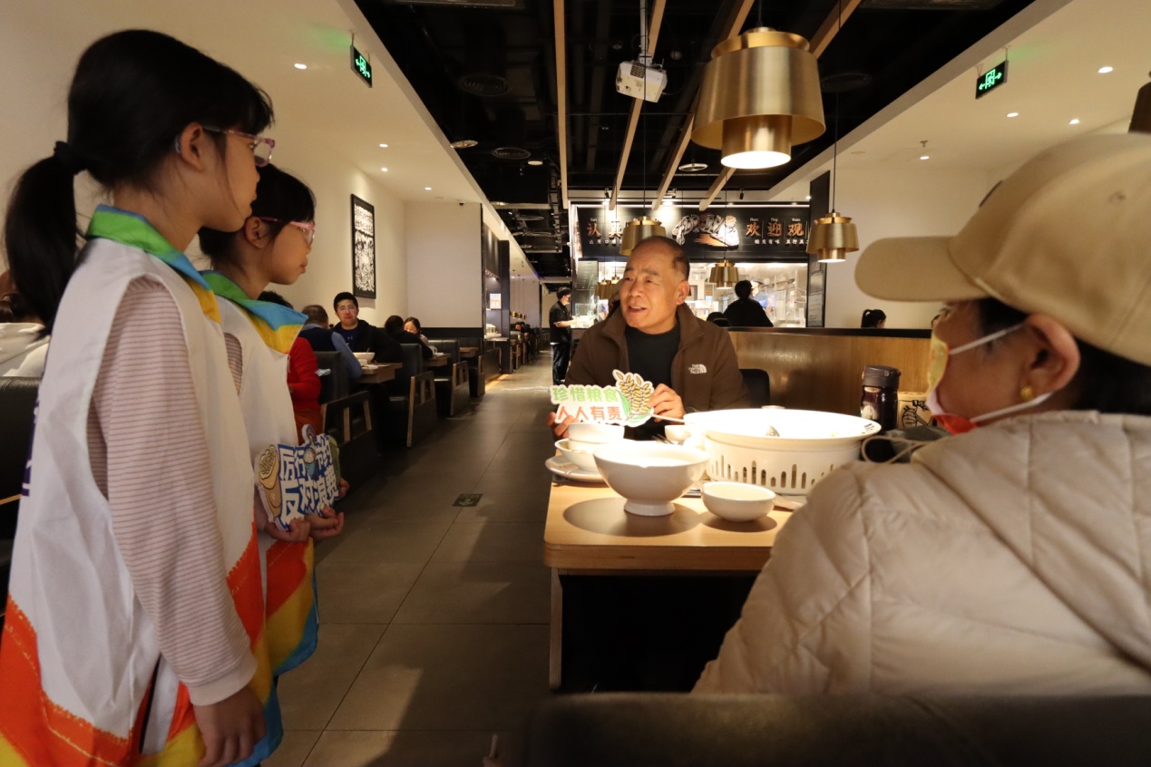 活动将科普与实践相结合,青少年志愿者们学以致用,在实践环节化身“制止餐饮浪费”宣传员,向餐厅中的消费者宣传节粮反浪费知识。