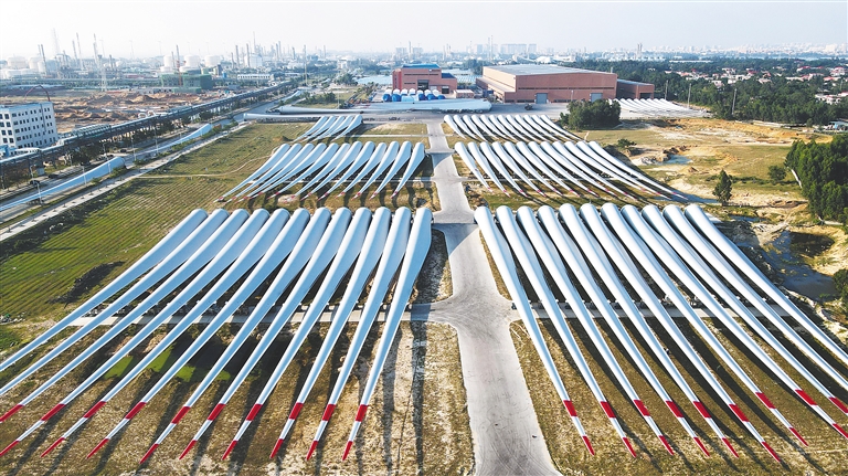 10月24日,东方临港产业园内的东方明阳科技新能源有限公司高端装备制造产业基地,众多巨型白色叶片有序排布,正等待通过陆运、海运多式联运运往全国各地风电场。据悉,这座总投资20亿元的产业基地目前已进入规模化生产阶段。