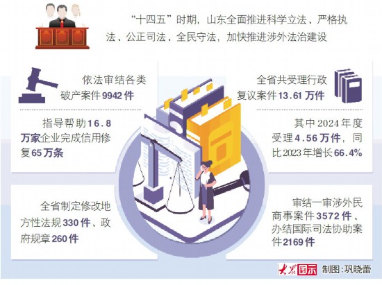 记者今天(10月9日)从省政府新闻办举行的新闻发布会上获悉,“十四五”时期,山东全面推进科学立法、严格执法、公正司法、全民守法,加快推进涉外法治建设,为新时代社会主义现代化强省建设提供了有力法治保障。山东连续四年入选营商环境最好10个省份,其中法治环境位居全国前列。