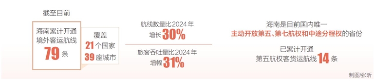 以航线为媒,海南加快推进航运开放。截至目前,海南累计开通境外客运航线79条,覆盖21个国家、39座城市;与2024年相比,航线数量增长30%,旅客吞吐量增长31%,交出一份令人瞩目的航运新答卷。