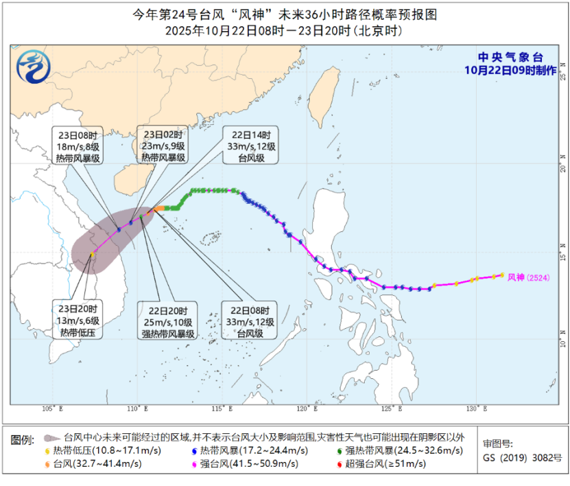 “风神”继续向西南方向移动。今年第24号台风“风神”昨天(10月21日)晚上加强为台风级,今天(10月22日)早晨8点钟其中心位于海南省三沙市(西沙永兴岛)西偏北方向大约155公里的海面上,中心附近最大风力有12级(33米/秒)。预计,“风神”将继续向西南方向移动,今天早晨至上午强度维持,而后逐渐减弱,并将于10月23日白天以热带风暴级(18~23米/秒,8~9级)在越南中部沿海登陆,登陆后强度快速减弱。