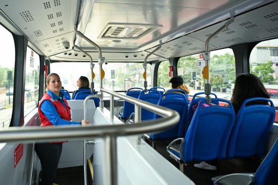 2023年11月2日,在智利首都圣地亚哥,一辆520路新能源公交车的工作人员在车内巡视。智利圣地亚哥520路公交路线是为2023泛美运动会特别开设的。新华社记者辛悦卫摄