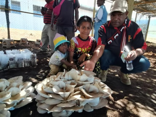 9月29日,在巴布亚新几内亚东高地省首府戈罗卡市,当地民众参观中国援巴布亚新几内亚菌草旱稻项目永久性示范基地种植的大平菇。新华社发(福建农林大学国家菌草工程技术研究中心供图)